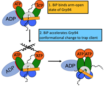 From the article: “The endoplasmic reticulum (ER) is the site at which secreted proteins (such as the hormone insulin) and membrane-bound proteins are folded. ATP-dependent chaperones within the ER help proteins fold. This study describes how two key ER chaperones, BiP and Grp94, work together at a molecular level. BiP binds to Grp94, which enables Grp94 to change conformation and hydrolyze ATP. In short, BiP provides a signal to switch on Grp94 conformational changes that are required to help other proteins fold. This finding helps explain how two chaperones can work together collaboratively in protein folding. Because BiP and Grp94 are members of highly conserved chaperone families, these findings may provide insight into chaperone-assisted protein folding beyond the ER.” This project was a collaboration with members of Timothy Street‘s lab in the Brandeis Biochemistry Department.
