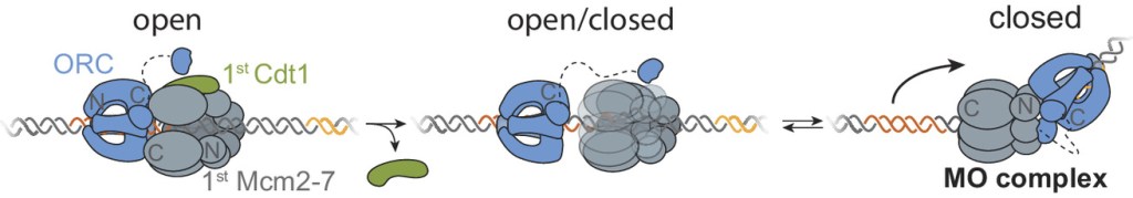 “Each time a eukaryotic cell divides (by mitosis) it must duplicate its chromosomal DNA exactly once to ensure that one full copy is passed to each resulting cell. Both under-replication or over-replication result in genome instability and disease or cell death. A key mechanism to prevent over-replication is the temporal separation of loading of the replicative DNA helicase [Mcm2-7] at origins of replication and activation of these same helicases during the cell division cycle.” Helicase loading is performed by the origin replication complex (ORC), a multi-subunit ATPase. In this study, Audra Amasino and Shalini Gupta from Steve Bell’s lab at MIT, working with Larry Friedman from the Gelles lab at Brandeis, define the mechanism by which cell cycle-dependent phosphorylation of the ORC inhibits helicase loading. Loading is a multi-step process and several steps are inhibited by phosphorylation, presumably helping to ensure that loading is completely suppressed during the S phase of the cell cycle during which the helicases are activated.