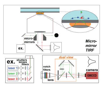 on elongation complex and modulate its activity. In this paper, Larry Tetone, Larry Friedman, and Melissa Osborne, along with their collaborators from the Gelles and Landick labs, used multi-wavelength single-molecule fluorescence methods to for the first time directly observe the dynamic binding and dissociation of an accessory protein with an RNAP during active transcript elongation. The protein, GreB, is important for transcript proofreading in E. coli and other bacteria and is a functional analog of the TFIIS protein in eaukaryotes. “Unexpectedly,” the authors report, “GreB was not selectively recruited to RNAPs requiring its transcript proofreading function. Instead, GreB transiently bound to multiple types of complexes, eventually finding via random search RNAPs that require its activity. The observations suggest a paradigm by which a regulator can act while minimizing obstruction of a binding site that must be shared with other proteins.”