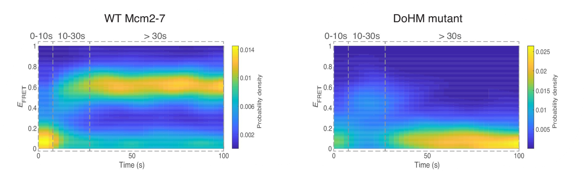 “Each time a eukaryotic cell divides (by mitosis) it must duplicate its chromosomal DNA exactly once to ensure that one full copy is passed to each resulting cell. Both under-replication or over-replication result in genome instability and disease or cell death. A key mechanism to prevent over-replication is the temporal separation of loading of the replicative DNA helicase [Mcm2-7] at origins of replication and activation of these same helicases during the cell division cycle.” Helicase loading is performed by the origin replication complex (ORC), a multi-subunit ATPase. In this study, Audra Amasino and Shalini Gupta from Steve Bell’s lab at MIT, working with Larry Friedman from the Gelles lab at Brandeis, define the mechanism by which cell cycle-dependent phosphorylation of the ORC inhibits helicase loading. Loading is a multi-step process and several steps are inhibited by phosphorylation, presumably helping to ensure that loading is completely suppressed during the S phase of the cell cycle during which the helicases are activated.