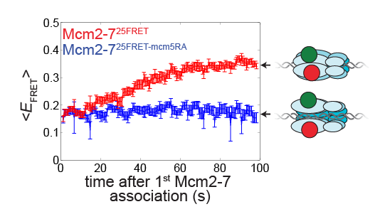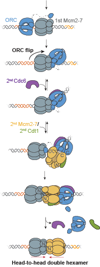 “Each time a eukaryotic cell divides (by mitosis) it must duplicate its chromosomal DNA exactly once to ensure that one full copy is passed to each resulting cell. Both under-replication or over-replication result in genome instability and disease or cell death. A key mechanism to prevent over-replication is the temporal separation of loading of the replicative DNA helicase [Mcm2-7] at origins of replication and activation of these same helicases during the cell division cycle.” Helicase loading is performed by the origin replication complex (ORC), a multi-subunit ATPase. In this study, Audra Amasino and Shalini Gupta from Steve Bell’s lab at MIT, working with Larry Friedman from the Gelles lab at Brandeis, define the mechanism by which cell cycle-dependent phosphorylation of the ORC inhibits helicase loading. Loading is a multi-step process and several steps are inhibited by phosphorylation, presumably helping to ensure that loading is completely suppressed during the S phase of the cell cycle during which the helicases are activated.